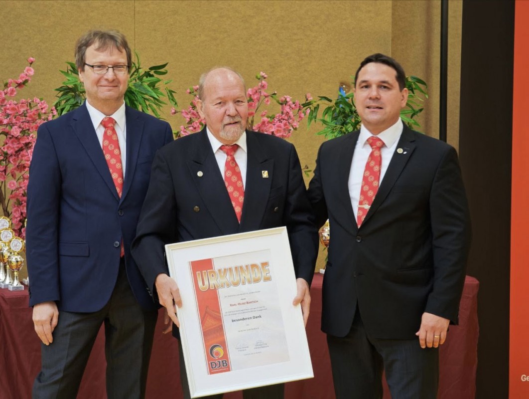 Als Zeichen des Dankes überreichte DJB-Katareferent Sebastian Frey ihm die DJB-Ehrung für außerordentlichen und langjährigen Einsatz im Wertungsrichterwesen.